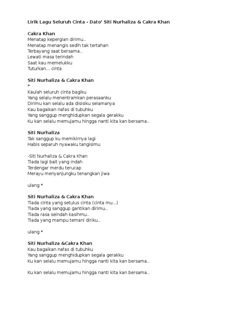 Music siti nurhalizacakra khan seluruh cinta karaoke lirik. Lagu seluruh cinta mp3 ✖. Meratap menangis sedih tak tertahan. Cakra khansiti nurhaliza lirik lagu seluruh cinta yasmin nap. Lirik lagu siti nurhaliza feat.