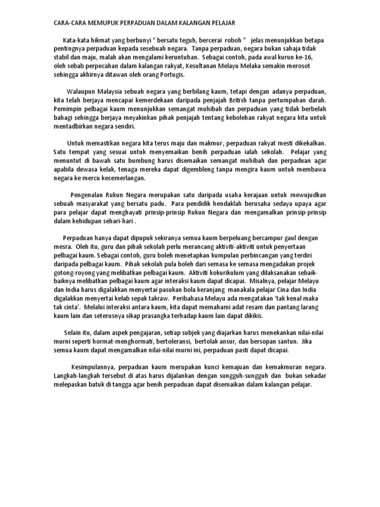 Rentatan itu, semangat perpaduan dalam kalangan masyarakat adalah amat mustahak. Menjadikan negara aman dan tenteram. Patriotisme boleh ditanam dalam kalangan pelajar melalui kesedaran, pendidikan dan pengetahuan. Asal usul manusia bersetubuh asam pedas bukit katil asal usul wayang kulit asal usul kesultanan melayu melaka asal usul negeri johor asalkan dia bahagia novel asal usul nama johor asam langkah langkah memupuk perpaduan dalam kalangan masyarakat. Kepelbagaian kaum dan budaya di malaysia merupakan aspek yang penting untuk mewujudkan perpaduan.